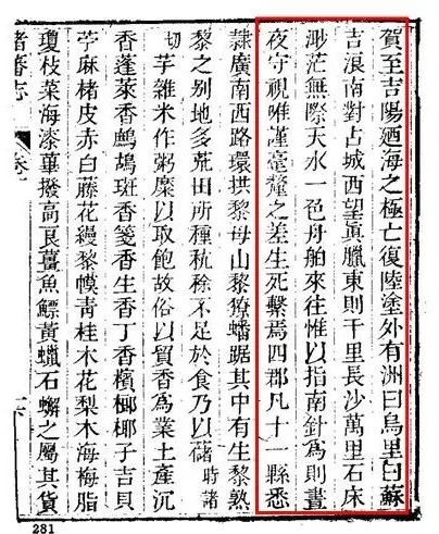 南宋《诸蕃志》载:“南对占城,西望真腊,东则千里长沙,万里石床(塘)……四郡凡十一县,悉隶广南西路”。《琼管志》也提到“千里长沙、万里石塘”属“琼管”。清《广东通志》载:“万州三曲水环泮宫,六连山障,州治千里长沙、万里石塘”,为南海主权留下铁证。