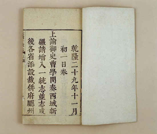 ▲《大清一统志》(乾隆五十五年刻本)书面及上谕。(图片来源:故宫博物院)