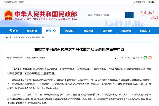 10月14日,东盟与中日韩积极应对老龄化能力建设培训在南宁启动。民政部党组成员、副部长刘振国,广西壮族自治区人民政府副主席眭国华出席培训开班式并致辞,东盟秘书长高金洪发表视频致辞。