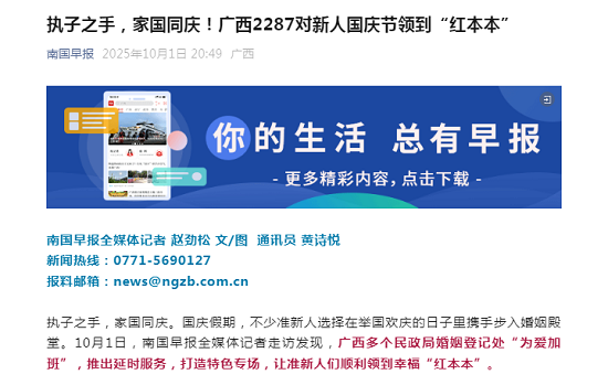 执子之手,家国同庆。国庆假期,不少准新人选择在举国欢庆的日子里携手步入婚姻殿堂。10月1日,南国早报全媒体记者走访发现,广西多个民政局婚姻登记处“为爱加班”,推出延时服务,打造特色专场,让准新人们顺利领到幸福“红本本”。