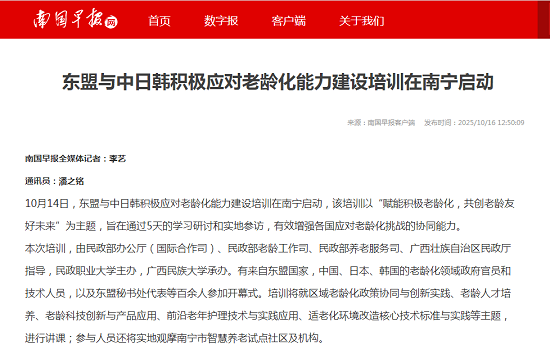 10月14日,东盟与中日韩积极应对老龄化能力建设培训在南宁启动,该培训以“赋能积极老龄化,共创老龄友好未来”为主题,旨在通过5天的学习研讨和实地参访,有效增强各国应对老龄化挑战的协同能力。