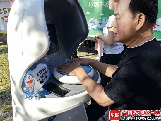 不少老年人对现场设置的“智慧健康+养老产品”体验展示区颇感兴趣。70岁的罗大爷体验了一款“5G智能机器人”,将手放在检测仪上刷刷脸,机器人2分钟就能开一份体质报告,还会对应给出饮食建议、定制食谱。“这台设备运用了中医大数据建模、光谱扫描等技术,能评估人体70余项指标。”现场的工作人员表示,他们从2024年开始就用这套设备在多个社区为老人免费检测,大家的体验感还不错。