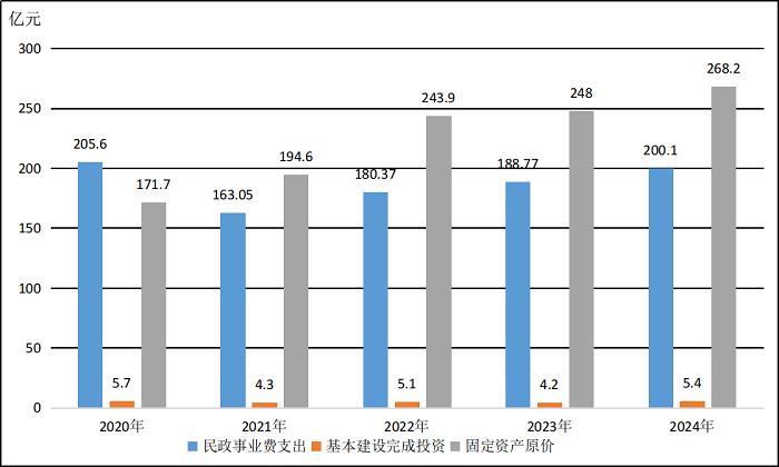 截至2024年底,全区民政部门登记和管理的机构和设施共计4.7万个,职工总数29.2万人,固定资产原价268.2亿元;各类民政服务机构和设施拥有床位22.6万张;全年实际完成基本建设投资总额5.36亿元,项目建设规模97.2万平方米;全区民政事业费支出200.1亿元,占全区财政一般公共预算支出的3.1%,其中:社会福利46.6亿元,社会救助128.3亿元,民政管理事务7.5亿元,行政事业单位养老支出1.6亿元,其他支出16.1亿元。