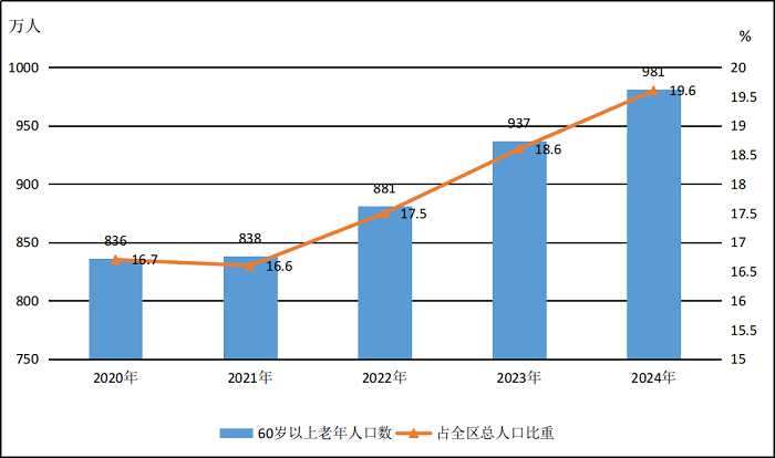 截至2024年底,全区60周岁及以上老年人口981万人,占总人口的19.6%,其中65周岁及以上人口700万人,占总人口的14%。截至2024年底,全区共有164.5万老年人享受老年人福利补贴,其中享受高龄津贴的老年人124.3万人,享受养老服务补贴的老年人40.2万人。全区共支出老年福利资金10.8亿元,养老服务资金4.7亿元。