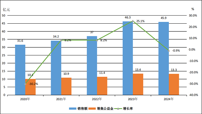 图6 2020-2024年福利彩票销售额、增长率及筹集公益金情况