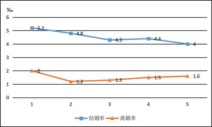4.结(离)婚率计算公式为:当年结(离)婚登记对数/当年平均人口数)x1000‰。