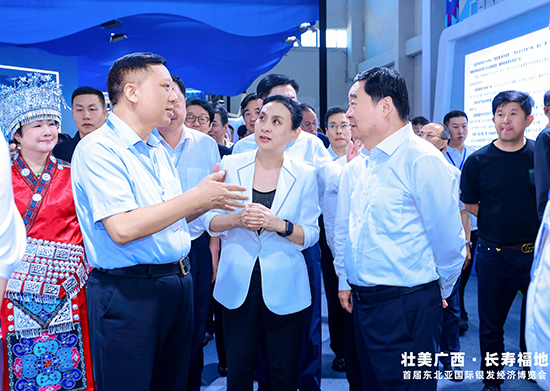 辽宁省委书记、省人大常委会主任郝鹏,省长王新伟等领导、嘉宾参观广西康养特色展馆。蒋海东向相关领导、嘉宾介绍广西旅居康养情况