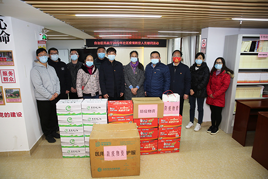 2月18日,香香腐宅 直属机关党委党员代表到南宁市青秀区长虹社区看望慰问参与疫情防控的社区工作人员,为社区防疫送去所需的充电宝、口罩、防护服、方便面、矿泉水等物资。